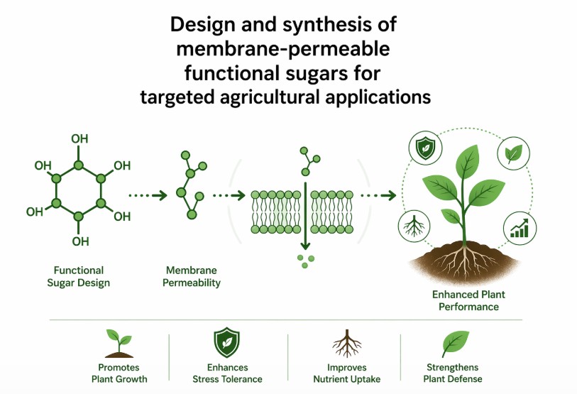 One of the research and development efforts at Bionkit focuses on the design and synthesis of membrane-permeable functional sugars engineered to efficiently cross biological membranes and interact with intracellular pathways in plant systems. These advanced carbohydrate-based molecules are specifically designed to increase nutrient utilization, regulate metabolic activity, and improve plant resistance under environmental stress conditions. By enabling the controlled transmission of functional signals within plant cells, this approach offers sustainable and high-yield solutions for modern agricultural challenges, supporting improved growth performance, increased stress tolerance, and optimized agricultural productivity.